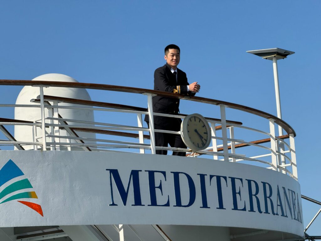 One of the most unforgettable memories on Adora Mediterranea is still fresh in my mind. It was in September 2023, when our ship traveled thousands of miles from Cyprus in Europe to Asia and completed maintenance and painting in Singapore dry dock, thus “officially” becoming Adora Mediterranea. At that time, this luxury cruise ship with an age of more than 20 years finally docked in Tianjin International Cruise Home Port, China, for the first time with a new look, and thus officially started her new journey as a ship under a Chinese Cruise Company. In a sense, she witnessed the end of an era and the beginning of another era, which is really wonderful. When I saw the Five-Starred Red Flag (The Flag of China)flying on the Adora Mediterranea, probably for the first time, my sense of pride could not be suppressed. That day, I shared this experience on my WeChat Moments, and also gave my friends a brief introduction to the history of this ship, sharing this joy and pride with them.
